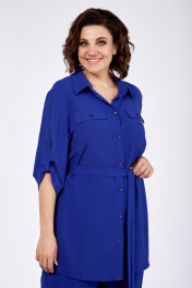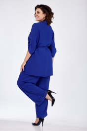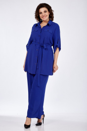 Силуэт полуприлегающий. Рукава втачные, одношовные. Низ рукавов драпируется патой с застёжкой на петлю и пуговицу. Длина рукава 40 см. Горловина с отложным воротником на стойке, рубашечного типа. Перед с нагрудными вытачками и со сквозной застёжкой на петли и пуговицы. Вверху полочек настрочены клапаны, которые декорированы пуговицами. Внизу боковых швов выполнены разрезы. В комплекте с блузкой идёт пояс Брюки широкие, с поясом на резинке. Длина блузки по спинке 82см. Длина брюк по боковому шву ( с учётом пояса) 106 см. Комплект выполнен из лёгкой ткани плательной группы. Обмеры брюк 62 р. – обхват бедер 134, длина 106, обхват бедер 82 Обмеры блузки 62 р – ПОГ 68, ПОБ 72, длина рукава 40, длина блузки 82
