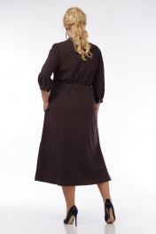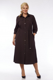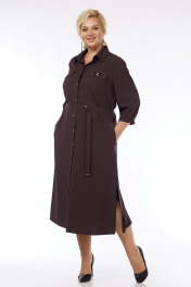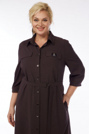 Силуэт полуприлегающий, расширенный к низу. Рукав втачной, одношовный. Низ рукава со складками и на манжете с застёжкой на пуговицу. Длина рукава 47 см. Горловина с отложным воротником на стойке, рубашечного типа. Перед с застёжкой до низа на пуговицы. Полочки с кокетками и нагрудными вытачками. В верхней части полочек расположены клапаны, дополнительно украшенные декоративным элементом. На уровне бёдер в боковых швах выполнены потайные карманы. Внизу боковых швов платье с разрезами. В комплекте к платью идёт пояс с застёжкой на пряжку. Конец пояса украшен металлическим зажимом. Длина платья по спинке 123 см. Платье выполнено из костюмно-плательной ткани54 р – ПОГ 58, ПОБ 63.