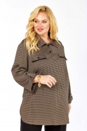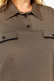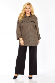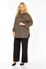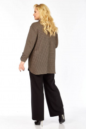 Рукава втачные, одношовные. Низ рукава драпируется патой с застёжкой на пуговицу. Длина рукава 54 см. Горловина с отложным воротником, рубашечного типа. Перед с нагрудными вытачками и кокетками с застёжкой на две пуговицы. В шов притачивания кокеток закреплены клапаны, декорированные чёрным кантиком и пуговицами. Внизу боковых швов джемпер с закруглёнными разрезами. Длина джемпера по спинке 78см. Джемпер выполнен из трикотажного полотна. 66 размер — ПОГ 72 ПОБ 74