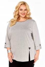 Силуэт полуприлегающий. Рукава втачные, одношовные. Длина рукава 45 см, внизу с отворотами, закреплённые патой с застёжкой на пуговицу. Горловина закруглённая, на обтачке с контрастным кантиком, которая закреплена отделочной строчкой. Перед с нагрудными вытачками. С левой стороны, от вытачки вниз выполнен рельеф с разрезом внизу. Разрез декорирован пришивным элементом. Длина джемпера 70 см. Джемпер выполнен из трикотажного полотна.