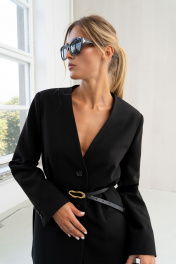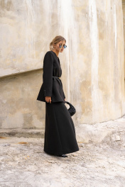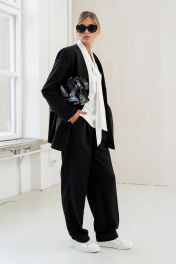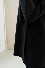 Универсальный (базовый) жакет свободного силуэта, с цельнокроеными бочками, и двумя шлицами впереди. Прорезные карманы в рамку. Спинка со средним швом. Рукав втачной , двухшовный, со шлицей и пуговицами. Жакет сочетает в себе элегантность делового стиля и элементы уличной моды, подчеркивает статус и достаток. Изделие выполнено из премиальной костюмной ткани. Длина жакета по среднему шву спинки 75 см. Длина рукава 62 см.