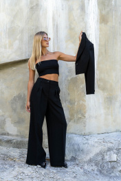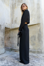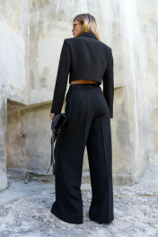 Брюки актуального, свободного кроя. На передних половинках заутюжены стрелки, переходящие в складки по линии талии. Застежка-гульфик, по переду боковые наклонные карманы. Пояс стабильный по переду, по задней части брюк на резинке, с настроченными шлевками и застежкой на пуговичку. Стильные брюки отлично визуально удлиняют ноги и формируют красивые пропорции силуэта, станут хорошей инвестицией на осенне-зимний сезон. Изделие выполнено из премиальной костюмной ткани. Длина брюк по боковому шву с поясом 109 см. Ширина брюк по низу +-31 см.