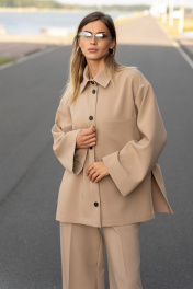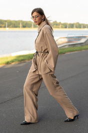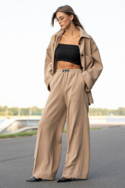 Брюки в цвете "Camel" прямого свободного силуэта. Пояс на резинке, по переду боковые наклонные карманы. На поясе декор в виде нашивки с лого. Длина брюк по боковому шву с поясом 108 см. Параметры брюк в готовом виде в 44 р.: обхват талии +-66 см (с резинкой ), обхват бедер 108 см.