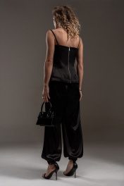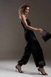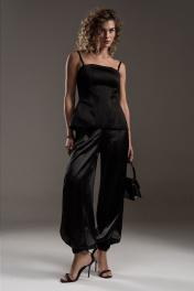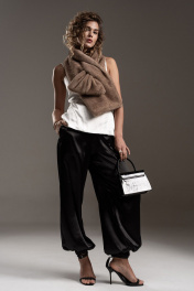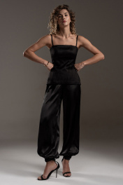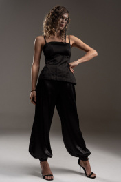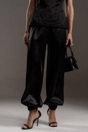 Брюки - "алладины", широкие, с поясом на резинке. Низ брюк собран на резинку. Карманы в боковых швах. Шелковистая ткань делает образ стильным и завораживающим. Брюки "алладины"- современный тренд благодаря сочетанию комфорта и стиля. Длина брюк с поясом +- 106 см Ширина брюк по низу до резинки в 44 р.+- 69 см. Обхват резинки по низу брюк в 44 р.: +-25 см. Параметры брюк в готовом виде в 44 р.: обхват талии 68 см, обхват бедер 102 см.