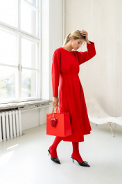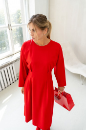 Стильное платье миди, приталенноо силуэта. Центральная часть переда с застроченными складками на талии, спинка со средним швом и талиевыми вытачками. Застежка молния в среднем шве спинки. В боковых швах функциональные карманы. Платье на поливискозной подкладке. Стильное красное платье - хорошая инвестиция на долгое время. Длина платья по центру спинки 115,5 см