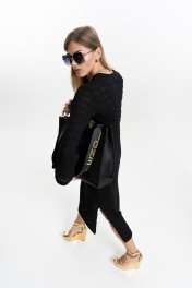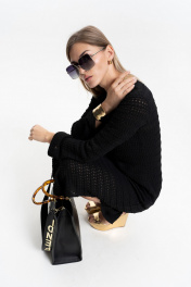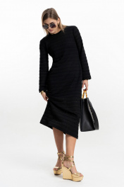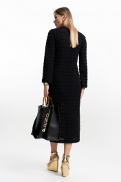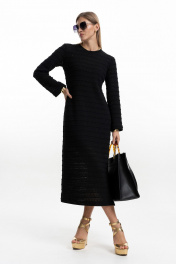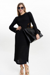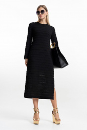 Платье миди из трикотажа полуприлегающего силуэта, с разрезом на левой стороне в боковом шве. Рукав втачной прямой. Горловина округлой формы, обработана бейкой. Полупрозрачная "вязаная" текстура трикотажа делает платье стильным и романтичным. Подкладкой служит отдельное нижнее платье-комбинация на брителях из трикотажного полотна. Длина платья по центру спинки 121 см. Высота разреза 39 см. Длина рукава 59 см.
