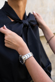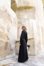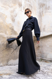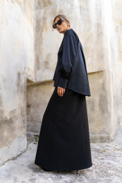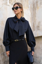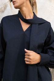 Блузка свободного силуэта, с А-образный вырезом горловины. Спинка с отрезной кокеткой и встречной складкой. Линия низа спинки фигурная, длиннее переда. Рукав на слегка спущенной пройме, с притачной манжетой, застегивающейся на 2 пуговицы. Воротник стойка переходящий в шарф, который можно эффектно завязать галстуком или бантом. Длина по центру спинки 74 см. Длина переда от плечевой точки 65 см.