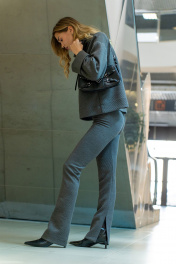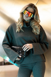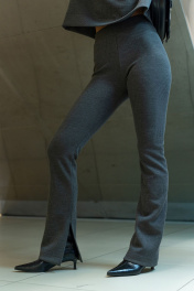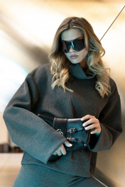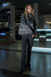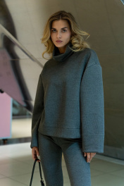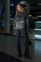 Комплект из фактурного, мягкого трикотажа ( полосы ). Джемпер оверсайз с длинным рукавом на спущенной пройме. Горловина округлой формы с объемным воротником стойкой. Брюки облегающего силуэта, слегка расклешенные к низу. Без бокового шва, с разрезом во внутреннем шве. Изделие с поясом на резинке. Длина брюк по внутреннему шву 84 см. ( по боковому шву с поясом 113 см. ) Длина джемпера по центру спинки 57см. Длина рукава от горловины 72см. ( длина плечевого шва 19см + длина рукава от проймы 53 см.) Высота стойки 16 см. Ширина по низу в полуобхвате +-65см. ( 46р ) Ширина рукава в полуобхвате +-19 см. ( 46р. )