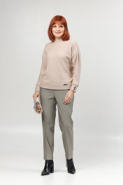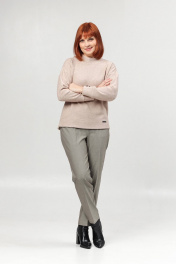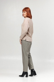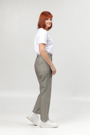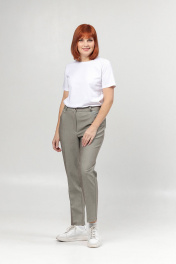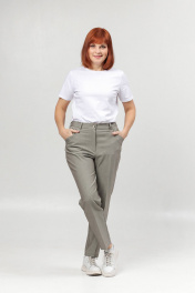 Классические женские брюки со стрелками. Перед с карманами, спинка - с вытачкой. Пояс на резинке в области спинки. Посадка высокая. Длина брюк от пояса по боковому шву - 102 см, по шаговому шву - 77 см.
