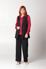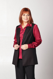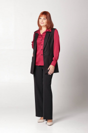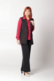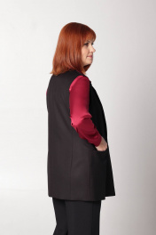 Жилет женский, на подкладке, полуприлегающего силуэта. Перед с подрезом по линии талии. В шве подреза обработаны карманы. Спинка с центральным швом и с рельефными швами из проймы. Застйжка по переду на одну петлю и пуговицу. Длина изделия по спинке - 75 см. На модели: Блуза - Модель 632, Брюки - Модель 614.