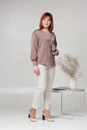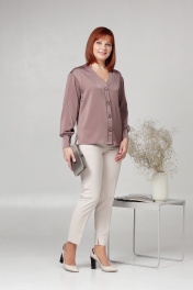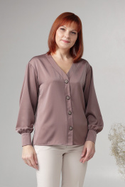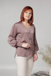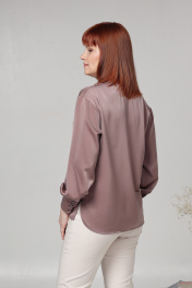 Блуза женская прямого силуэта, со спущенным плечевым швом. Перед с притачными фигурными планками и с центральной застёжкой на петли-пуговицы. Рукав широкий. По низу рукава прорешка. Низ рукава присборен на манжету. Манжета с застёжкой на петли-пуговицы. Перед, по отношению к спинке, укорочен на 3 см. В боковых швах - разрезы. Длина рукава по плечевому шву с манжетой - 74 см. Длина изделия: размеры 44,46 - 66 см, далее +1 см к размеру. Замеры изделия в готовом виде в области проймы и бёдер: размер 44 - 100 см, далее +4 см к размеру.