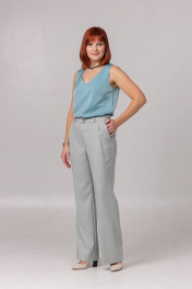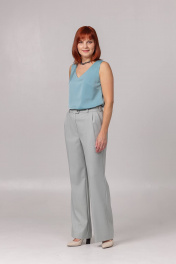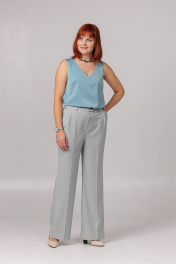 Брюки женские, прямые от колена. По переду карманы с наклонным входом и две складки. Спинка с талевой вытачкой. Застёжка на молнию. Верхний срез обработан притачным поясом + шлёвки. Пояс в области спинки с резинкой. Средняя длина по боковому шву без пояса - 106 см. Ширина брюк внизу: размер 42 - 53,5 + 0,5 см к размеру.