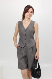 Жилет женский полуприлегающего силуэта, с рельефными швами по переду и спинке. Перед с центральной застежкой на петли и пуговицы. В рельефные швы спинки, в области талии, встален поясок для регулировки прилегания. Горловина, проймы и низ жилета обработаны обтачками. Жилет без подкладки. Длина изделия по спинке - 48 см.