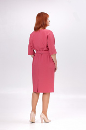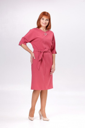 Платье женское прямого силуэта с цельнокроеными рукавами. Перед со средним швом и декоративным элементом в области горловины. В срежнем шве спинки застежка на потайную молнию и шлица. Низ рукава обработан обтачкой. Брошь и тканевый пояс в комплекте. Длина рукава - 45 см.