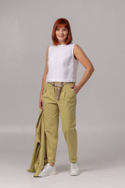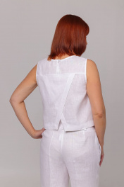 Топ прямого силуэта. Перед с нагрудными вытачками из боковых швов. Спинка с отрезной кокеткой. Нижняя часть спинки с запахом. По спинке, в области горловины, застёжка на навесную петлю и пуговицу Длина топа по спинке - 44,5 см (+/- 0,5 см).