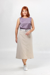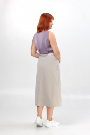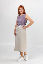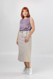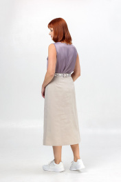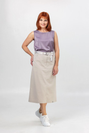 Юбка женская, силуэт - трапеция. Перед с боковыми карманами, в среднем шве - застежка на молнию. Спикна с талевыми вытачками и центральным швом. Талевый срез обработан притачным поясом с застежкой на петлю и пуговицу. Ремень в комплекте.