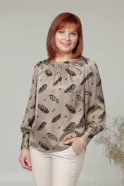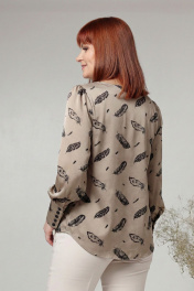 Блуза женская прямого силуэта без плечевого шва. Горловина спинки и переда обработана притачными планками. Перед укорочен по отношению к спинке на 2 см. Низ переда и спинки, в области боковых швов, оформлен полукругом. Рукав втачной, широкий. По окату и по низу рукава сборка. Низ рукава обработан широкой притачной манжетой с застежкой на 5 петель-пуговиц. Длина рукава с манжетой - 62 см. Длина издели по спинке: размер 44,46,48 - 68 см далее +1 см к размеру.