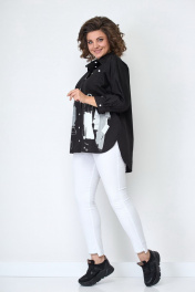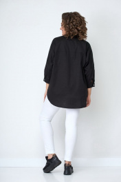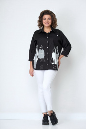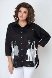 Блузка женская из хлопковой ткани. Подойдет для женщин разной возрастной категории и разного телосложения. Блузка удлиненная, свободного кроя. Застежка-планка с прорезными петлями на пуговицах. Спинка свободного кроя без талиевых вытачек. По центру спинки кокетка. Воротник рубашечного типа. Низ изделия с фигурными вырезами по боковому шву. Украшением изделия служит печать. Линия плеча спущенная, рукав притачной, по низу рукава манжет с застежкой на пуговицу. Есть накладной карман. Цвет черный