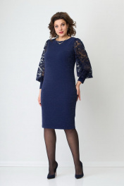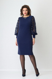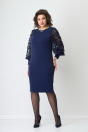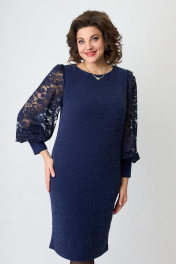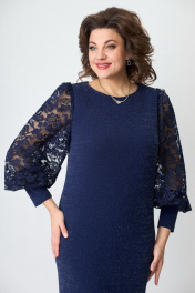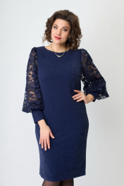 Платье женское из двух видов ткани. Основная ткань- цветной трикотаж с люрексовой нитью. Спереди платья нагрудные вытачки. Главным украшением платья служат рукава из сетки, заканчивающийся манжетой из основной ткани. По спинке талиевые вытачки выгодно корректирующие фигуру. Застежки нет. Шлица отсутствует. Горловина округлая.