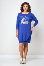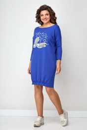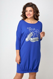 Платье свободного силуэта со спущенным рукавом. Горловина округлая. Рукав ¾. По низу боковой шов смещенный. Спинка переходит на переднюю часть полочки, за счет этого визуально уменьшается размер и фигура кажется стройнее. Низ полочки на широком (3см) резинке, платье не кажется объемным, на ширину шага не влияет. Украшением платья служит термо-печать.Длина по переду в 50-52-96см, по спинке-108см, по переду в 54-58-100см, по спинке-112см.