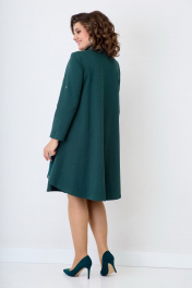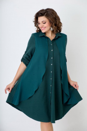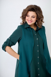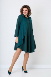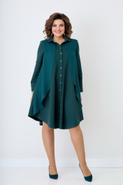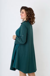 Женское платье, выполненное из трикотажной ткани. Предназначенное для женщин любого возраста. Платье свободного кроя, расширенное к низу, со вставкой в виде шифона по всей длине изделия. Рукав втачной, ¾, длина рукава регулируется с помощью паты, на пуговице. По боковому шву фигурный подрез. Воротник рубашечного типа. В боковых швах имеются карманы. Платье застегивается по переду пуговицами.