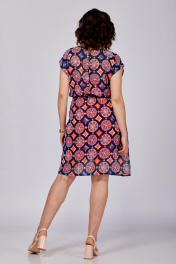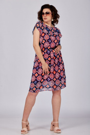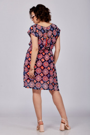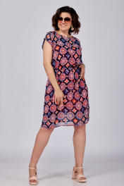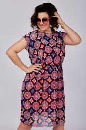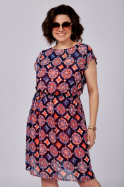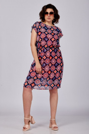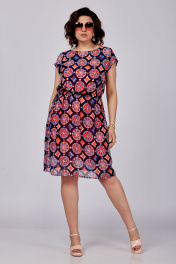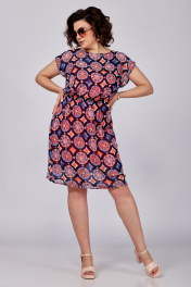 Платье женское, состоящее из основного платья и трикотажной подкладки-комбинации на удлиненных бретельках, которые можно укоротить в зависимости от объема груди. Основное платье отрезное по линии талии, на резинке. Без рукавов. Горловина округлая. Спинка с застежкой в верхней части на навесную петлю и пуговицу. Рост модели 173 см. Длина спинки от плеча в 54 р. – 99 см. Полуобхват проймы– 25 см.