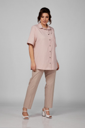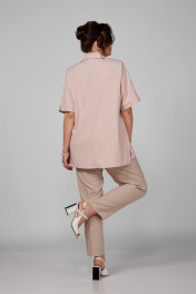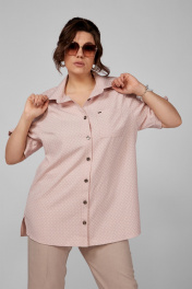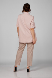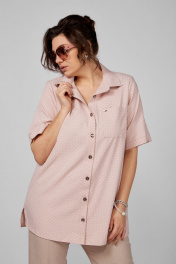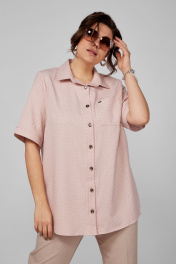 Блузка женская прямого силуэта, с втачными короткими одношовными рукавами. По низу рукавов узкие притачные манжеты с разрезом. Перед с нагрудными вытачками, выходящими из бокового шва, и накладным функциональным карманом на уровне груди. Воротник рубашечного типа, на притачной стойке. Застежка центральная, на притачной планке, с петлями и пуговицами. Спинка со средним швом. По низу боковых швов обработаны разрезы. С плечевыми накладками. Рост модели 173 см. Длина спинки по среднему шву в 58 р. – 77 см. Длина рукава – 31 см. Ширина рукава на уровне груди – 24 см. Полуобхват проймы– 36 см.