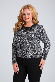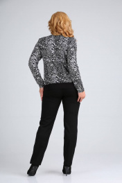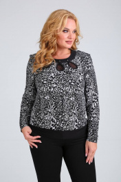 Блузка женская полуприлегающего силуэта с втачными одношовными рукавами. Перед с нагрудными вытачками, выходящими из бокового шва. Горловина округлая, обработана обтачкой, украшена отрезной деталью с окантованными «капельками». По низу изделия – притачная облегающая планка из контрастного материала. Спинка цельная. Рост модели 173 см. Блузка с плечевыми накладками. Длина спинки по среднему шву в 56 р. – 61 см. Длина рукава – 63см. Ширина проймы на уровне груди – 19 см. Полуобхват проймы – 28 см