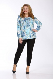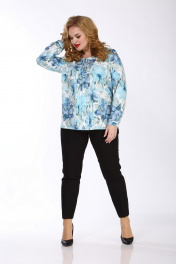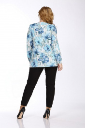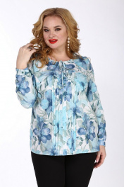 Блузка женская прямого силуэта с втачными одношовными рукавами. Перед отрезной выше линии груди. Горловина округлой формы, окантована косой бейкой, с завязками. По центру нижней части переда имитационная узкая планка с пуговицами. По обе стороны застрочены рельефные отделочные швы до линии низа. Перед с нагрудными вытачками, выходящие из бокового шва. По низу рукава узкая притачная манжета. Для регулировки длины имеется узкая пата. Спинка с кокеткой выше линии лопаток и встречной складкой по линии притачивания кокетки. По боковым швам выполнены разрезы. Изделие с плечевыми накладками. Рост модели 173 см. Длина спинки по среднему шву в 52 р. – 72 см. Длина рукава – 62 см. Ширина рукава на уровне груди – 21см. Полуобхват проймы – 28 см.