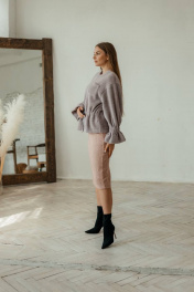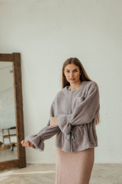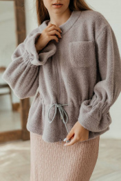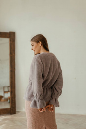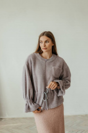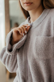 Кардиган женский, мягкий, теплый. Рукав длинный, слегка спущенный, расклешенный снизу на резинке. Спереди кардиган на молнии, слева небольшой карман без клапана.