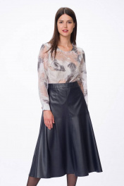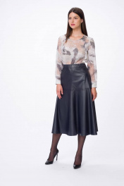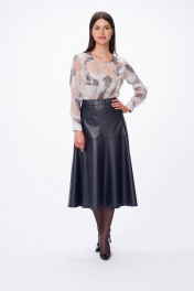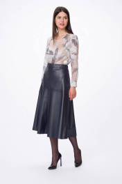 Стильная юбка из "эко"-кожи, расширенная к низу на притачном поясе. Застежка на металлическую тесьму-молния в среднем шве спинки. По переду и спинки юбки горизонтальные подрезы и подрезы имитирующие карманы.