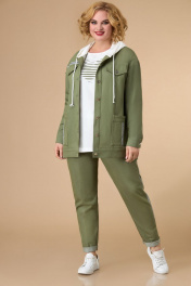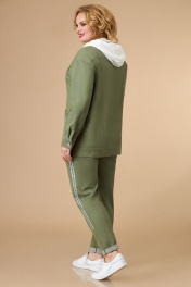 Костюм женский трёхпредметный, состоящий из куртки, туники и брюк. Куртка прямого силуэта. Линия плеча спущена. Куртка с центральной бортовой застежкой с планкой на 6 петель и пуговиц. Полочки куртки с горизонтальными кокетками и вертикальными рельефами от кокеток. В швах притачивания кокеток декоративные клапана, застегивающиеся на петлю и пуговицу. В нижней части куртки по полочкам большие накладные карманы. Спинка с горизонтальной кокеткой и вертикальными рельефами от шва кокетки до низа. Рукав длинный на притачной манжете. По горловине капюшон. Туника прямого силуэта. Линия плеча спущена. По полочке аппликация. Брюки заужены книзу. Передние детали брюк с отрезными боковыми частями, в которых обработаны карманы. На задних деталях брюк обработаны накладные карманы. Пояс притачной на резинке по кругу. Длина куртки в размерах 52-56 72 см, в размерах 58-60 77 см Длина рукава куртки от высшей точки горловины до низа 75 см Длина туники в размерах 52-56 63 см, в размерах 58-60 68 см Длина брюк 92 см