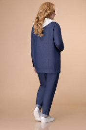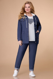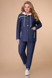 Костюм женский трёхпредметный, состоящий из куртки, туники и брюк. Куртка прямого силуэта. Линия плеча спущена. Куртка с центральной бортовой застежкой с планкой на 6 петель и пуговиц. Полочки куртки с горизонтальными кокетками и вертикальными рельефами от кокеток. В швах притачивания кокеток декоративные клапана, застегивающиеся на петлю и пуговицу. В нижней части куртки по полочкам большие накладные карманы. Спинка с горизонтальной кокеткой и вертикальными рельефами от шва кокетки до низа. Рукав длинный на притачной манжете. По горловине капюшон. Туника прямого силуэта. Линия плеча спущена. По полочке аппликация. Брюки заужены книзу. Передние детали брюк с отрезными боковыми частями, в которых обработаны карманы. На задних деталях брюк обработаны накладные карманы. Пояс притачной на резинке по кругу. Длина куртки в размерах 52-56 72 см, в размерах 58-60 77 см Длина рукава куртки от высшей точки горловины до низа 75 см Длина туники в размерах 52-56 63 см, в размерах 58-60 68 см Длина брюк 92 см