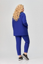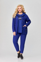Костюм женский трёхпредметный, состоящий из куртки, туники и брюк. Куртка прямого силуэта. Линия плеча спущена. Куртка с центральной бортовой застежкой с планкой на 6 петель и пуговиц. Полочки куртки с горизонтальными кокетками и вертикальными рельефами от кокеток. В швах притачивания кокеток декоративные клапана, застегивающиеся на петлю и пуговицу. В нижней части куртки по полочкам большие накладные карманы. Спинка с горизонтальной кокеткой и вертикальными рельефами от шва кокетки до низа. Рукав длинный на притачной манжете. По горловине капюшон. Туника прямого силуэта. Линия плеча спущена. По полочке аппликация. Брюки заужены книзу. Передние детали брюк с отрезными боковыми частями, в которых обработаны карманы. На задних деталях брюк обработаны накладные карманы. Пояс притачной на резинке по кругу. Длина куртки в размерах 52-56 72 см, в размерах 58-60 77 см Длина рукава куртки от высшей точки горловины до низа 75 см Длина туники в размерах 52-56 63 см, в размерах 58-60 68 см Длина брюк 92 см