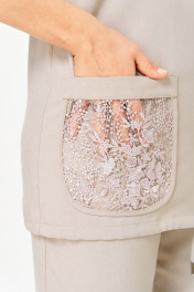 Костюм женский двухпредметный, состоящий из жакета и брюк. Жакет прямого силуэта. Застежка на молнию. По горловине капюшон на кулисе. По полочкам накладные карманы. Карманы, вставка рукава и капюшон выполнены из гипюра. Низ жакета на кулисе. Брюки зауженные книзу с отворотом. В боковых швах брюк карманы. Пояс притачной на резинке по кругу. Дизайн гипюра может отличаться. Длина жакета по центру спинки 81 см Длина рукава от высшей точки горловины до низа 62 см Длина брюк 89 см