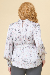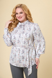 Блузка из струящейся ткани, свободного силуэта. Горловина переда с декоративной сборкой и воротником – хомут. Отделкой служит съемный бант. Спинка со средним швом, по воротнику с застежкой на две петли и пуговицы. Рукав длинный втачной со сборкой по окату, по низу сборка на широкой манжете. Длина блузки по спинке 67 см Длина рукава блузки 65 см