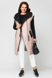 Жилет женский прямого силуэта, со спущенной линией плеча, на подкладке. По горловине капюшон. По переду прорезные карманы с листочкой. Спинка в верхней части со швом, по спинке и полочке косые подрезы. Застежка смещенная на молнию. Низ жилета фигурной формы. Отличный вариант жилета для стильных образов! Фурнитура может меняться в зависимости от наличия. Длина по спинке: 98 см