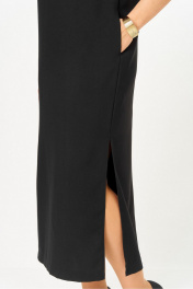 Платье женское прямого кроя, с коротким цельнокроеным рукавом. Вырез горловины округлой формы. В среднем шве спинки застежка молния. В боковых швах обработаны карманы и разрезы. В комплекте с платьем съемное украшение в виде цветка. Длина платья по спинке 127 см Длина рукава 32 см