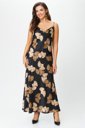 Комплект женский двухпредметный состоит из платья и жакета. Платье атласное длиной миди на тонких регулируемых бретелях с вырезом «качели». Жакет с цельнокроенным рукавом «летучая мышь». По горловине воротник на стойке, без застежки. По низу переда завязки. Платье и жакет можно носить вместе или по отдельности. Длина платья по спинке: 133 см Длина спинки жакета: 50 см Длина рукава от горловины: 49 см