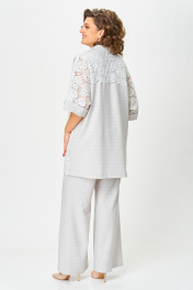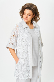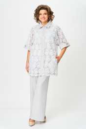 Костюм женский трехпредметный, состоящий из кардигана, топа и брюк. Кардиган прямого силуэта покроя «летучая мышь». По переду прорезные карманы с листочкой. Застежка на молнию. По горловине отложной воротник. По спинке отрезная кокетка. Рукав короткий заканчивающейся притачной манжетой. Топ полуприлегающего силуэта. В боковых швах разрезы. Брюки расширены книзу. Застежка на молнию, а по поясу на петлю и пуговицу. В зависимости от наличия, кружево может меняться. Длина кардигана по центру спинки: 87 см Длина рукава от высшей точки горловины до низа: 48 см Длина топа: 75 см Длина брюк:107 см