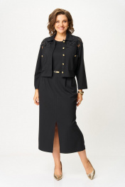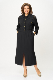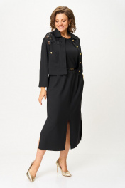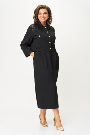 Костюм женский двухпредметный состоящий из платья и жакета. Платье полуприлегающего силуэта, без рукава. Перед платья с горизонтальным швом по талии. Верхняя часть с вытачками по линии груди, нижняя часть со складками в области талии и карманами, что обеспечивает прекрасную посадку и подчеркивает фигуру. Высокие разрезы по бокам и переду платья добавляют удобства. В комплекте съемный ремень. Жакет прямого кроя с застежкой на петли и пуговицы, с втачным рукавом. Линия плеча спущена, по горловине отложной воротник. По переду накладные карманы. Кокетка из кружева по переду и спинке добавляет романтичности и легкости. Длина платья по спинке: 123 см Длина жакета по спинке: 46 см Длина рукава от горловины: 66 см