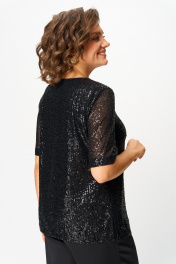 Блузка женская прямого силуэта из ткани пайетка с втачным рукавом. Горловина округлой формы обработана обтачкой. По линии груди вытачки. Рукав длиной до уровня локтя. В боковых шах обработаны разрезы. Перед и спинка блузки на трикотажной подкладке. Длина середины спинки: 63 см Длина рукава: 30 см