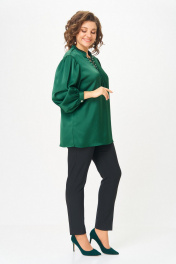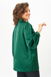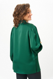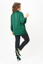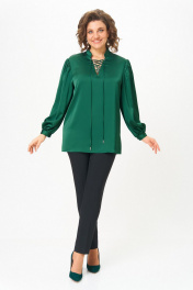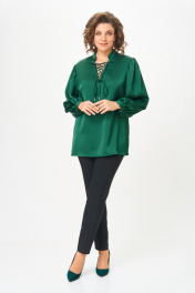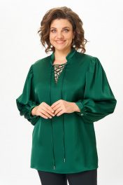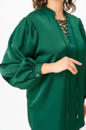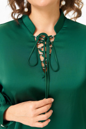 Блузка женская прямого кроя, с втачным рукавом. Горловина v- образной формы с воротником стойкой декорирована контрастной шнуровкой. Спинка цельная. Рукав длинный со сборкой по окату, низ рукава присобран на притачную манжету с застежкой на петлю и пуговицу. В боковых швах обработаны разрезы. Длина блузки по спинке: 73 см Длина рукава: 61 см