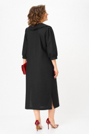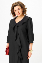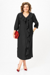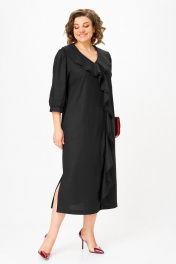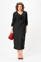 Платье женское прямого силуэта длины миди с втачным рукавом и разрезами. По горловине и переду двойной волан, расположенный вертикально. По линии груди вытачки. В боковых швах обработаны карманы. Рукав длиной ¾, присборенный по окату и низу с притачной манжетой. Длина по спинке: 120 см