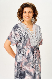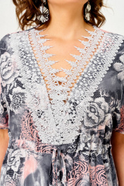 Платье женское свободного прямого силуэта с цельнокроеным рукавом обеспечивает свободу движений и добавляет образу легкости. Вырез горловины v-образный, декорирован кружевом. По переду чуть выше линии талии кулиса. Спинка со средним швом. В боковых швах обработаны разрезы. Длина платья по спинке: 130 см Длина рукава от горловины: 35 см
