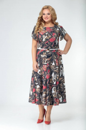Платье из тонкого текстиля прилегающего силуэта. По переду и спинке лифа расположены рельефы. Юбка расклешенная из шести клиньев со встречными складками по линии талии. В среднем шве спинки предусмотрена молния. Рукав втачной покроя тюльпан, длина рукава 15 см. В комплекте ремень с декоративной пряжкой. Длина изделия по спинке 120 см