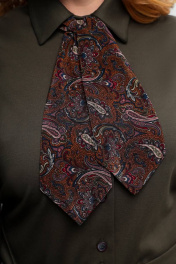 Платье женское полуприлегающего силуэта на подкладке. Выполнено из комбинирования двух видов материалов: трикотажного полотна и шифона. Платье с длинными втачными рукавами, по низу, которых - манжеты. Воротник стояче-отложной. Перед лифа платья с нагрудными вытачками и центральной застежкой на планку, которая застёгивается на 9 петель и 9 декоративных пуговиц. Горловина платья декорирована съёмным галстуком. Спинка лифа платья цельнокроеная. В боковых швах расположены две детали пояса, которым можно интересно обыграть линию талии. Воротник, манжеты, пояс, перед и спинка лифа выполнены из трикотажного полотна. Юбка платья, рукава и галстук - из принтованного шифона. Длина изделия 127 см. (±1 см). Длина рукава 62 см. (±1 см).