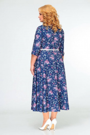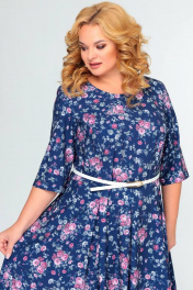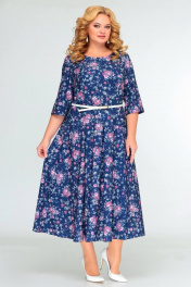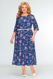 Платье из тонкого текстиля полуприлегающего силуэта, отрезное по линии талии. По переду и спинке лифа расположены рельефы. Юбка расклешённая из шести клиньев со встречными складками. В среднем шве спинки предусмотрена молния. Рукав втачной 3/4, длина рукава 40см (±1см). В комплекте ремень с декоративной пряжкой. Длина изделия по спинке 128 см