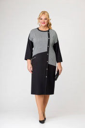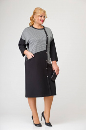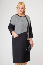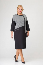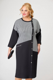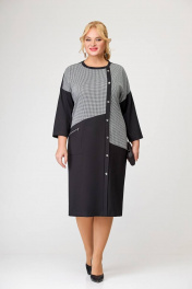 Платье прямого силуэта, выполненное из комбинирования двух видов трикотажных полотен. Платье - со спущенной линией плеча и длинным одношовным рукавом. Горловина платья круглая. Перед - с косыми подрезами и, смещённой от линии центра, притачной планкой с декоративными пуговицами. В области бедра расположен накладной карман с декоративной молнией. Спинка со средним швом. Длина изделия по спинке в 56,58,60 размерах 111 см (+/- 1см). Длина изделия по спинке в 62,64,66 размерах 117 см (+/- 1см). Длина от верхней плечевой точки до низа рукавав 56,58,60размерах 63 см (+ /- 1см). Длина от верхней плечевой точки до низа рукавав 62,64,66 размерах 65 см (+ /- 1см).
