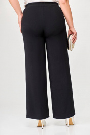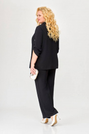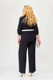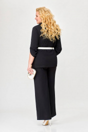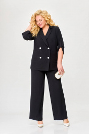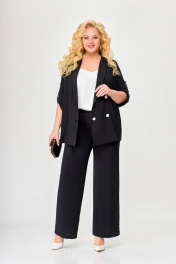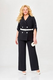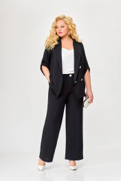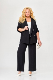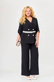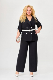 Костюм 2-х предметный, состоящий из жакета и брюк, выполненный из ткани с эффектом «жатка». Жакет прямого силуэта, двубортный, без подкладки. По переду обработаны нагрудные вытачки. Воротник – пиджачного типа. Застёжка на 4 петли и 4 контрастные декоративные пуговицы. Спинка цельнокроеная. Рукав втачной одношовный длинной ¾ с патой, застёгивающейся на петлю и декоративную пуговицу. Внутренние швы окантованы отделочной тканью. Длина рукава в 52,54,56 размерах 45 см (+/-1 см). Длина рукава в 58, 60 ,62 размерах 48 см (+/-1 см). Длина по среднему шву спинки в 52, 54, 56размерах - 69см (+/-1 см). Длина по среднему шву спинки в 58, 60, 62 размерах - 71см (+/-1 см). Брюки прямого силуэта от линии бёдер. По переду обработаны карманы с отрезными бочками. Пояс притачной с резинкой по спинке. Застёжка центральная на молнию и декоративную пуговицу. Длина брюк по боковому шву от шва притачивания пояса 106 (+/-1) см. В комплекте ремень шириной 3 см с декоративной пряжкой. В зависимости от партии ремень (пряжка) может меняться.